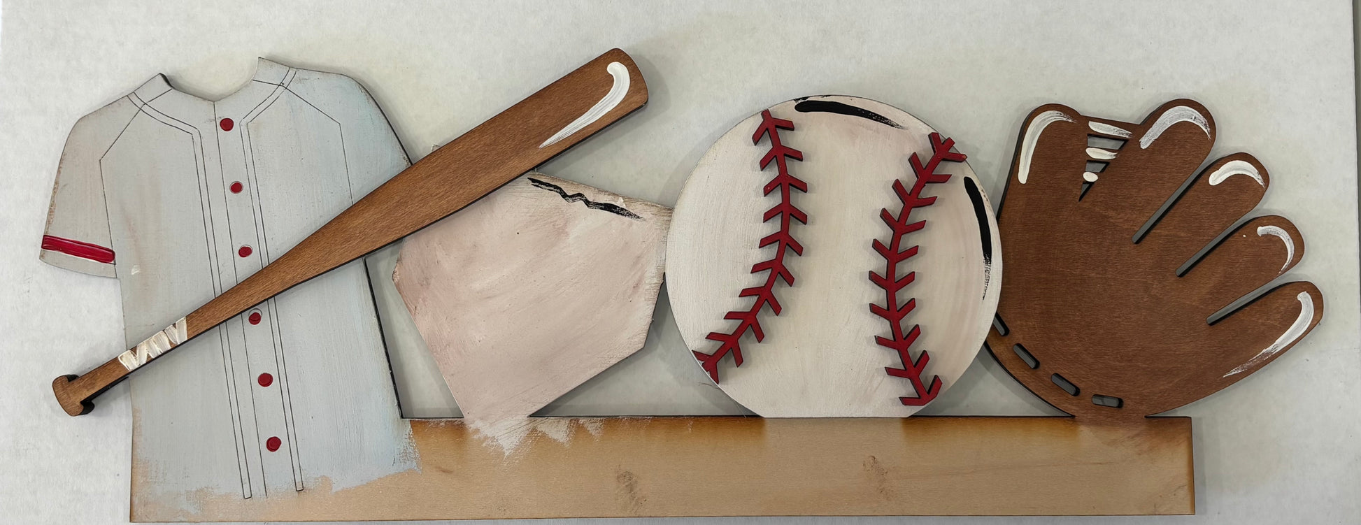Step up your décor game with this baseball-themed insert perfect for sports lovers and baseball season alike. Featuring classic elements like a bat, jersey, baseball, and glove, this design captures the spirit of the game with charming, handcrafted detail. Your choice of colors for the jersey